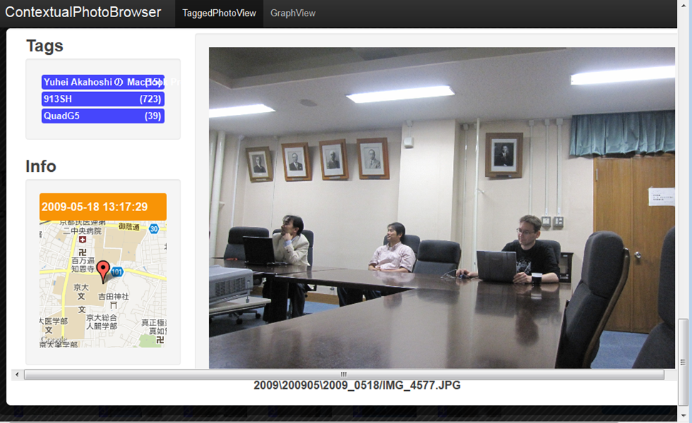 この研究では,周辺のBluetooth端末やモバイルルータなどの情報を取得して撮影時に 一緒にいる人などを認識し,その情報に基づく検索を可能とするものです.
