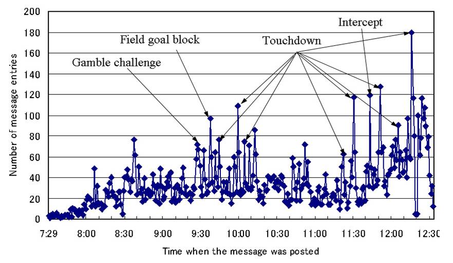 上記のグラフはただ単にチャットの書き込み量だけを利用していましたが,喜びや悲しみを利用するとまた違ったダイジェストを作ることが出来ます.また,巨人対阪神や,鹿島対浦和のようにライバル関係にあるチーム同士の場合,巨人ファンが悲しんでいる部分でのダイジェストを生成すると,阪神ファンにとって面白いダイジェストになるというのも興味深い部分です.